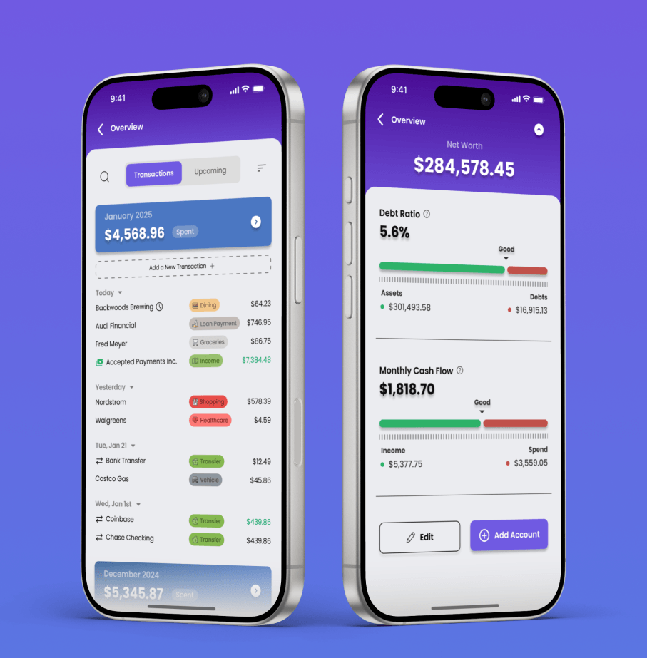 Stay on track of your long-term financial goals by unifying all your accounts in one place with separate asset and debt categories.